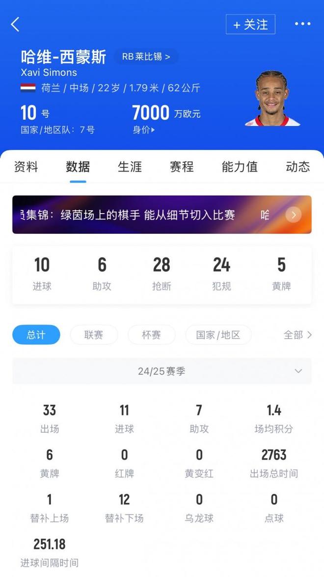 哈维-西蒙斯现年22岁,上赛季代表莱比锡各赛事出场33次,贡献11球7助,目前球员德转身价为7000万欧元。